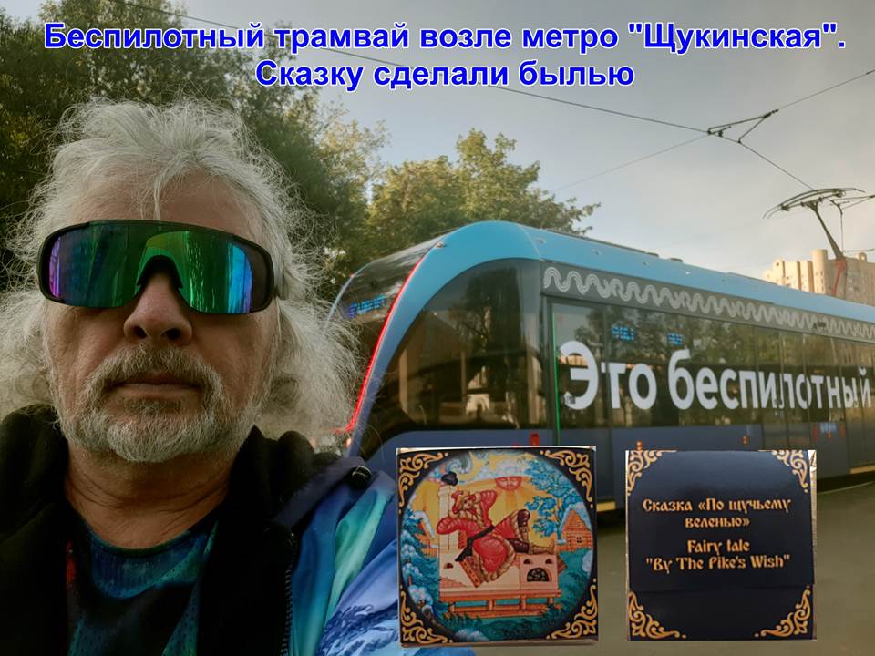 В Сергиев Посаде в Троице Сергиевой лавре с внуком рассматривали святыни. Он увидел съедобное, как выразился. Купил ему и себе шоколадок «Сказки». Съел шоколадку, стал умней, вспомнил, что беспилотный трамвай на станции метро «Щукинская». Сказку сделали былью, жаль что не отразили в скульптуре, беспилотный трамвай первый в России.