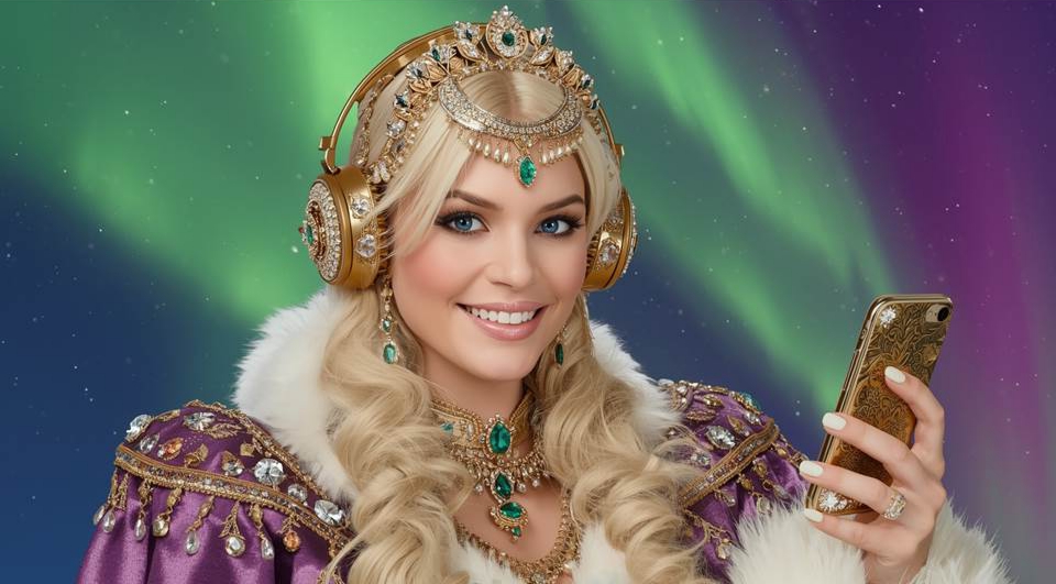 Королева Северного Сияния снова вошла — в этот раз её платье было не только светом, но и золотыми, бумажными и цифровыми слоями, в которых отражались сразу все эпохи человеческой веры.